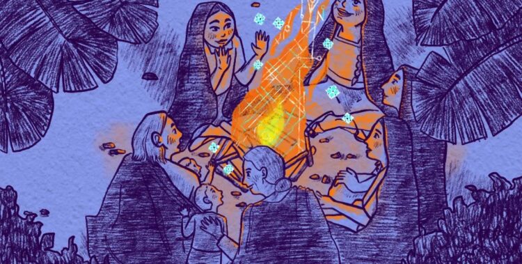 Imagen: Aproximarnos a la IA como nuestras ancestras al fuego: en ronda, desde el cuidado colectivo y resguardando nuestras historias. Imagen de Shari Avendaño, ilustradora y periodista venezolana.