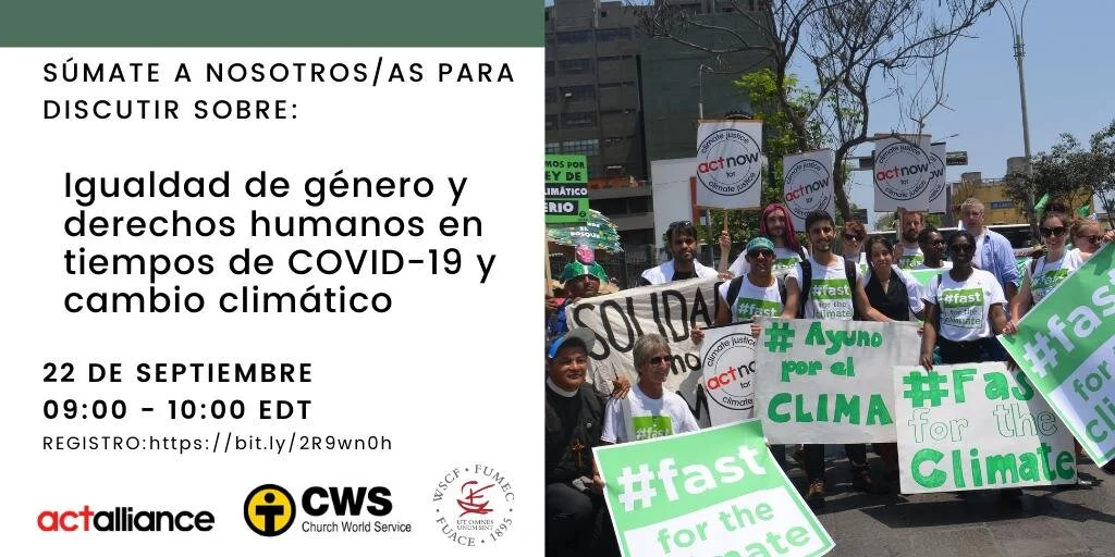 Una discusión virtual organizada por el grupo de cambio climático de ACT Alianza, Church World Service-CWS y la Federación Universal de Movimientos Estudiantiles Cristianos-FUMEC denominada “Igualdad de género y derechos humanos en tiempos de COVID-19 y cambio climático” se realizará el 22 de setiembre.