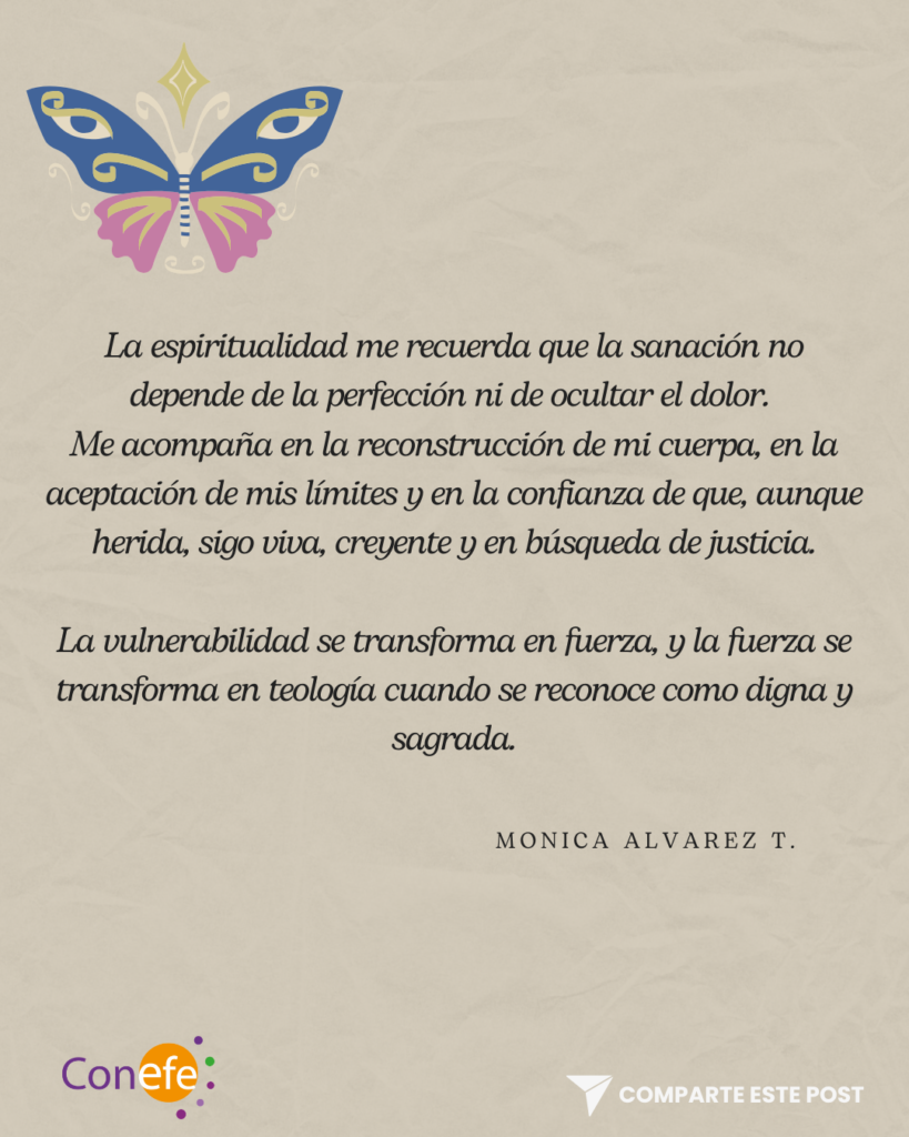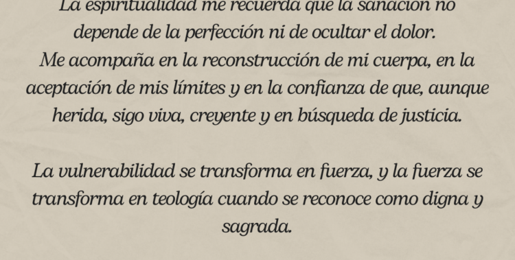 La espiritualidad me recuerda que la sanación no depende de la perfección ni de ocultar el dolor. Me acompaña en la reconstrucción de mi cuerpa, en la aceptación de mis límites y en la confianza de que, aunque herida, sigo viva, creyente y en búsqueda de justicia.